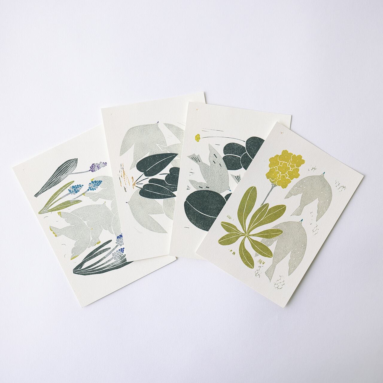 消しゴム版画でデザインした8種類のポストカードのセットです。1枚1枚にデザインされた鳥や草花が、優しい気持ちにさせてくれます。お部屋に飾っても楽しんでいただけます。